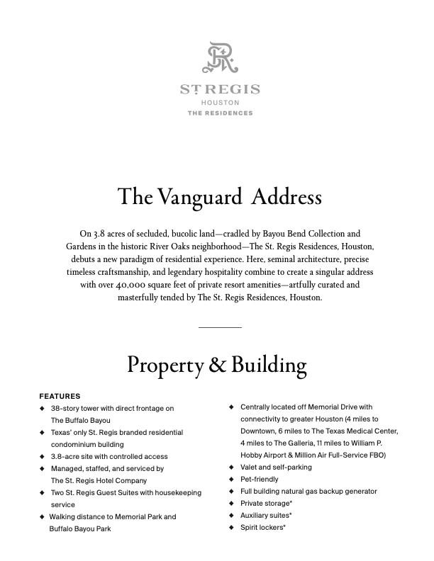 The St. Regis Residences, Houston — an exclusive collection of 90 private residences — offers residents the timeless sophistication of the St. Regis legacy, with world-class amenities, bespoke interiors, and five-star service in residence. The 3.8 acres of secure, private, resort-like setting along the graceful Buffalo Bayou, offers panoramic views…