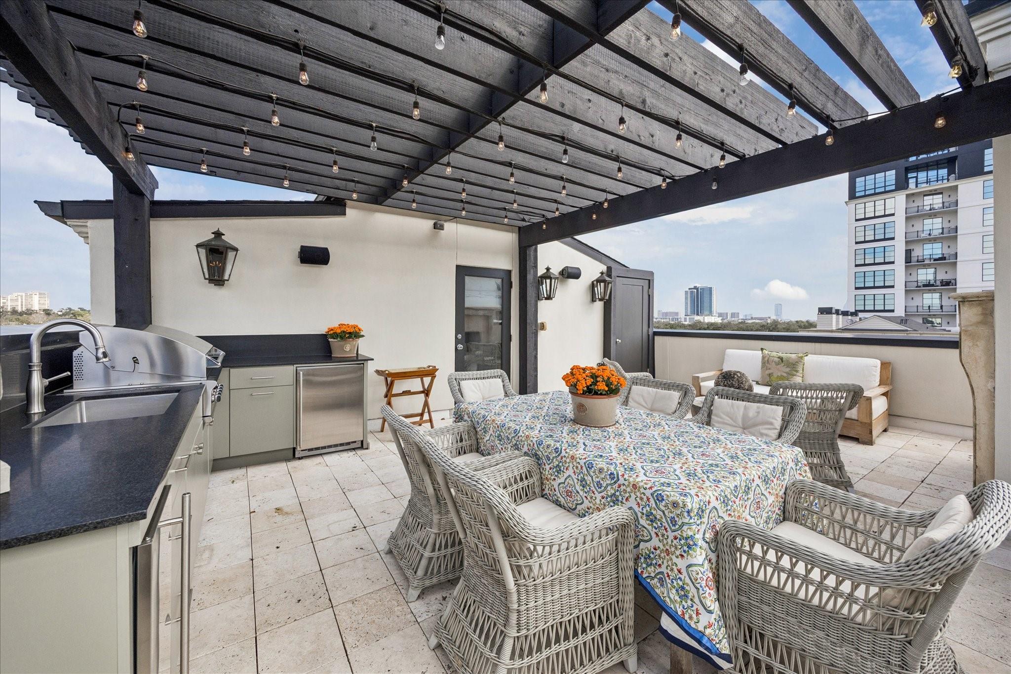 Stunning townhome in the gated River Oaks enclave of Winfield Gate offering elegant lock-and-leave living with custom upgrades throughout. Light-filled spaces feature high ceilings, hardwood floors, and a custom fireplace mantel creating warm, inviting living areas. Gourmet kitchen with Chateau Domingue antique doors, Walker Zanger marble countertops, Sub-Zero refrigerator, wine fridge, and Viking enamel range, along with generous storage and thoughtful design. The home includes a separate private study, a spacious gameroom perfect for entertaining or relaxing, and a serene primary suite with a beautifully customized walk-in closet. Enjoy the expansive rooftop terrace with fireplace, outdoor kitchen, and sweeping views of Downtown Houston, the Texas Medical Center, and River Oaks — an ideal space for gatherings or quiet evenings. Elevator to all floors. All Per Seller